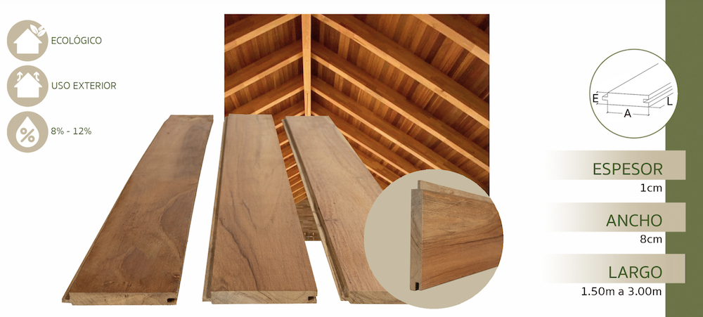 La tablilla en teca para techo aporta un acabado cálido, uniforme y resistente en cualquier ambiente interior. Su estabilidad frente a la humedad y su tonalidad dorada la convierten en una opción premium para quienes buscan belleza natural sin sacrificar durabilidad. Ideal para proyectos residenciales o comerciales que valoran materiales nobles con excelente comportamiento técnico.